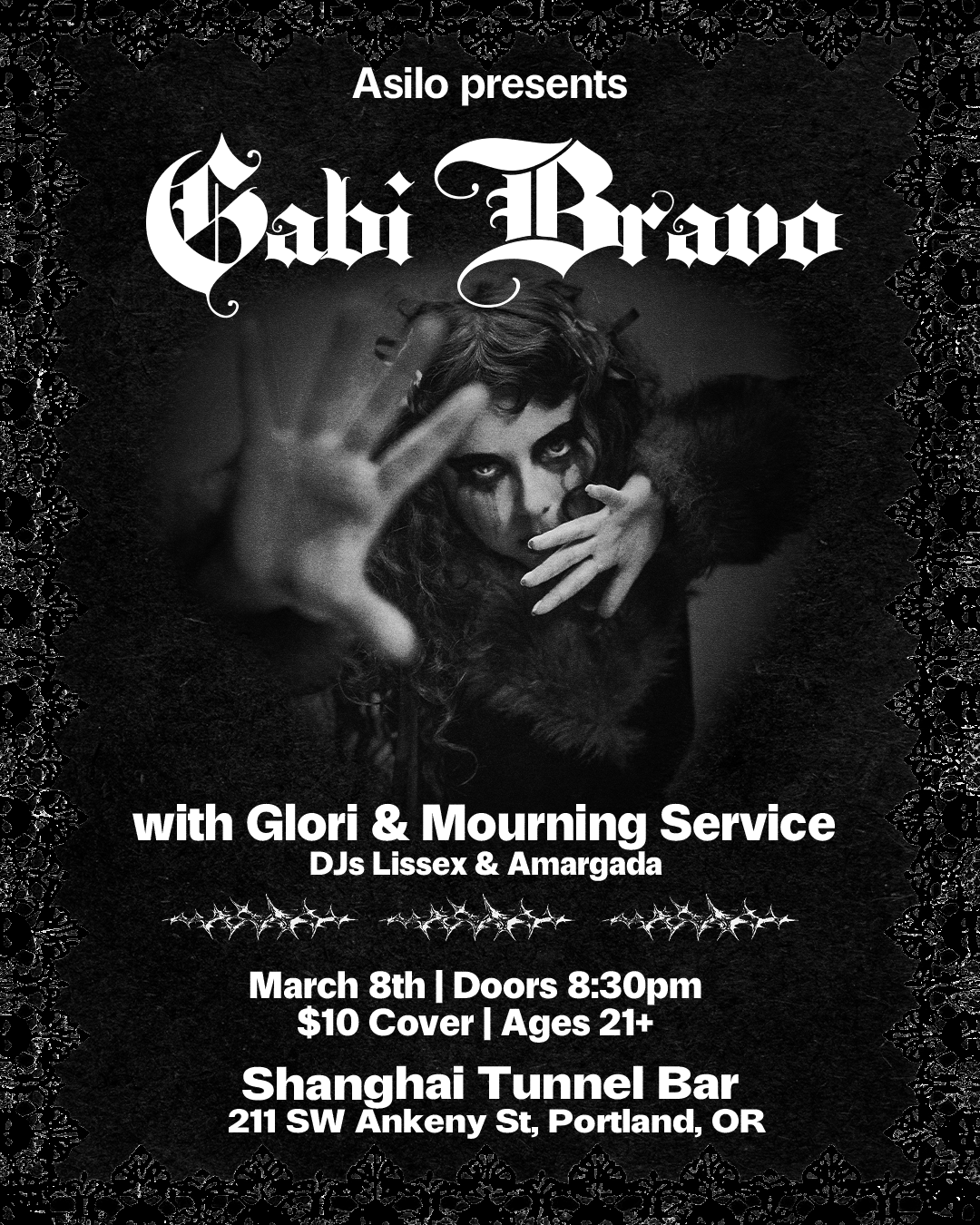Gabi Bravo is a Santa Cruz–based synth pop artist creating dark, dance-driven pop inspired by 80s electronic music with Latin roots and a bilingual approach. Gabi Bravo blends English and Spanish vocals built on driving electronic drums, layered synthesizers, andemotive vocals. The music is moody, rhythmic, and immersive. Local Support: Hardware synthpop dirges from Glori & up and coming PDX Goth, Mourning Service