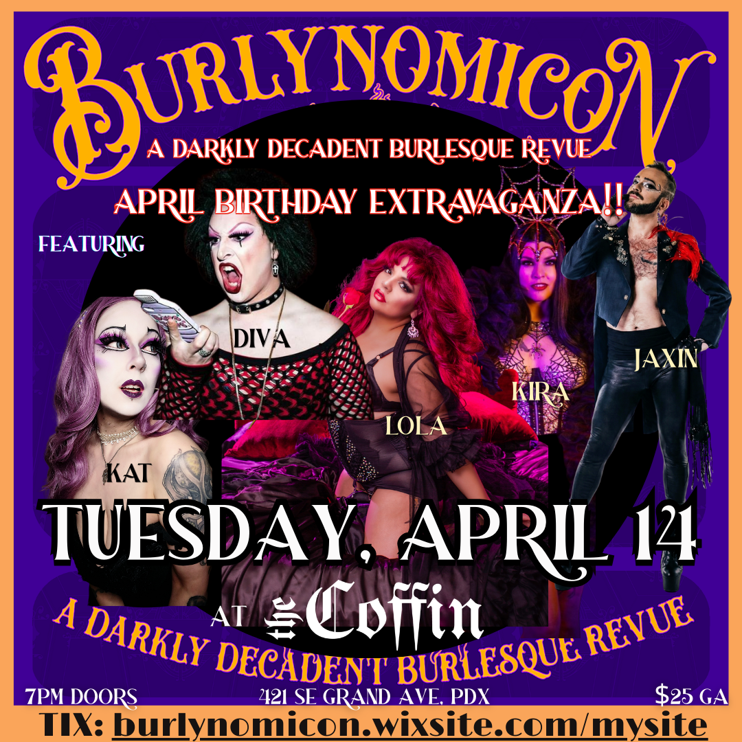 We LOVE celebrating the births of incredible beings, and on Tuesday, April 14, we celebrate 50 revolutions around the sky orb of our gloriously timeless keeper of the booze with an all star cast of his most beloved performers! We will gather in the intimate upstairs venue to witness a spectacular showing of the best darkly decadent performance art amongst resplendently eerie surroundings, where you can also peruse the delightful wares of our vendor, delight in delicious cocktails, indulge in food to nourish your weary soul, and encounter a magical being that will tell you of your fortune. Join us in glorious revelry and witness live and direct... DIVA DOTT! KIRA VON SUTRA! KAT VAN DAYUM! JAXIN RYAN! & LOLA COQUETTE! *Be sure to check out our glorious vendors... BABEFINDER GENERAL & BURLYNOMICON merch! Get a glimpse into your future with OPHELIA DARKLY's Victorian Doll Tarot readings! Produced and hosted by Natasha Riot, Burlynomicon is a darkly decadent monthly showcase of p